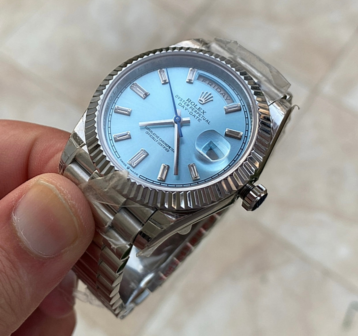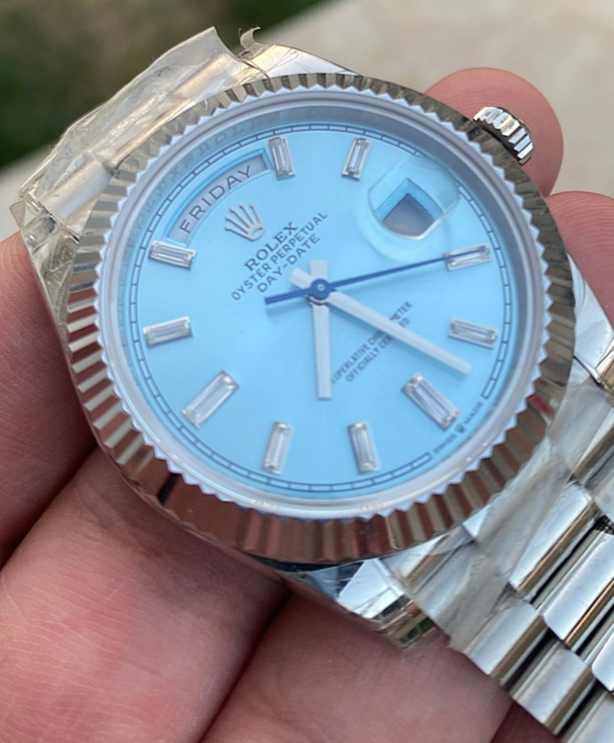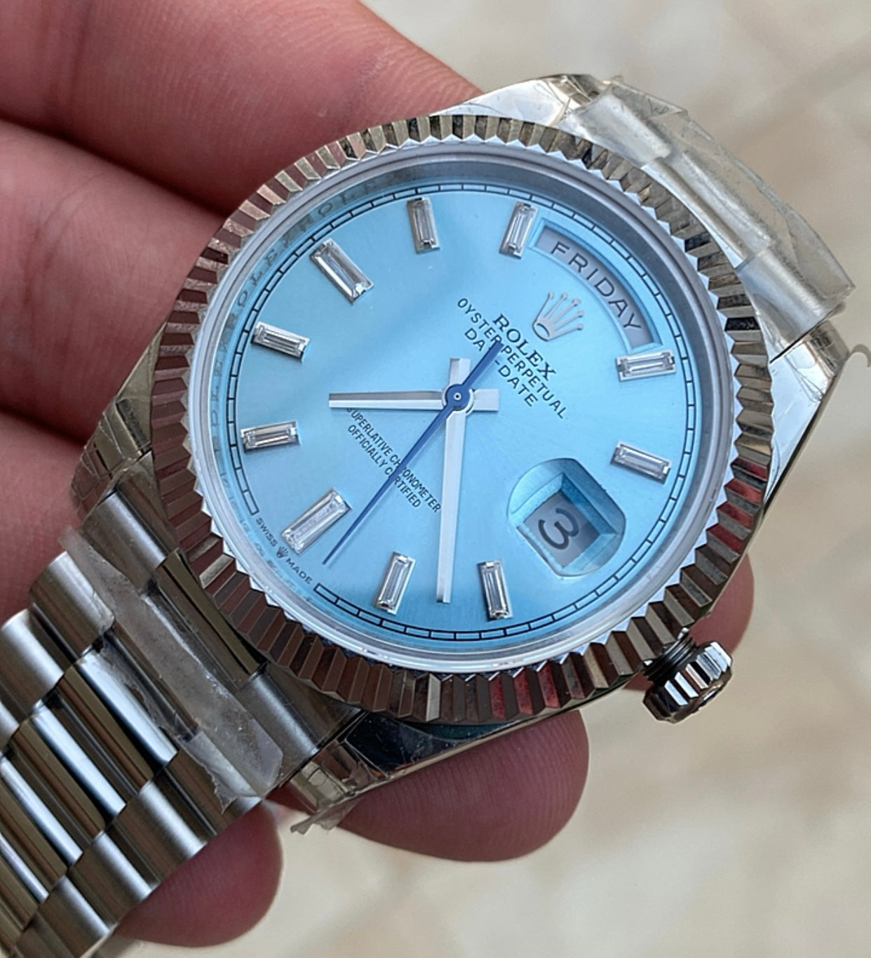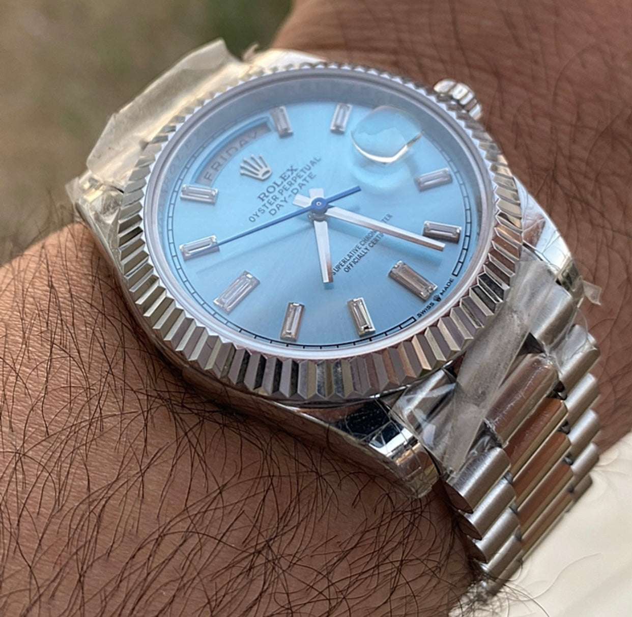 رولكس داي ديت مينا ايس بلو- كلين طبق الاصل لاتفرق - ماكينة مطابقة لرواكس الاصلية - سيريال حقيقي محفور عالساعة