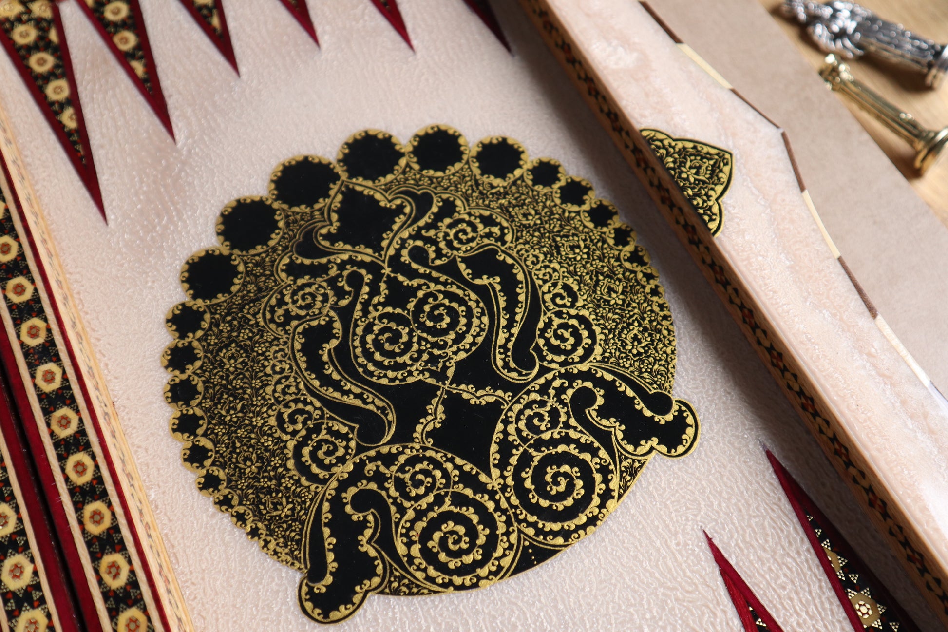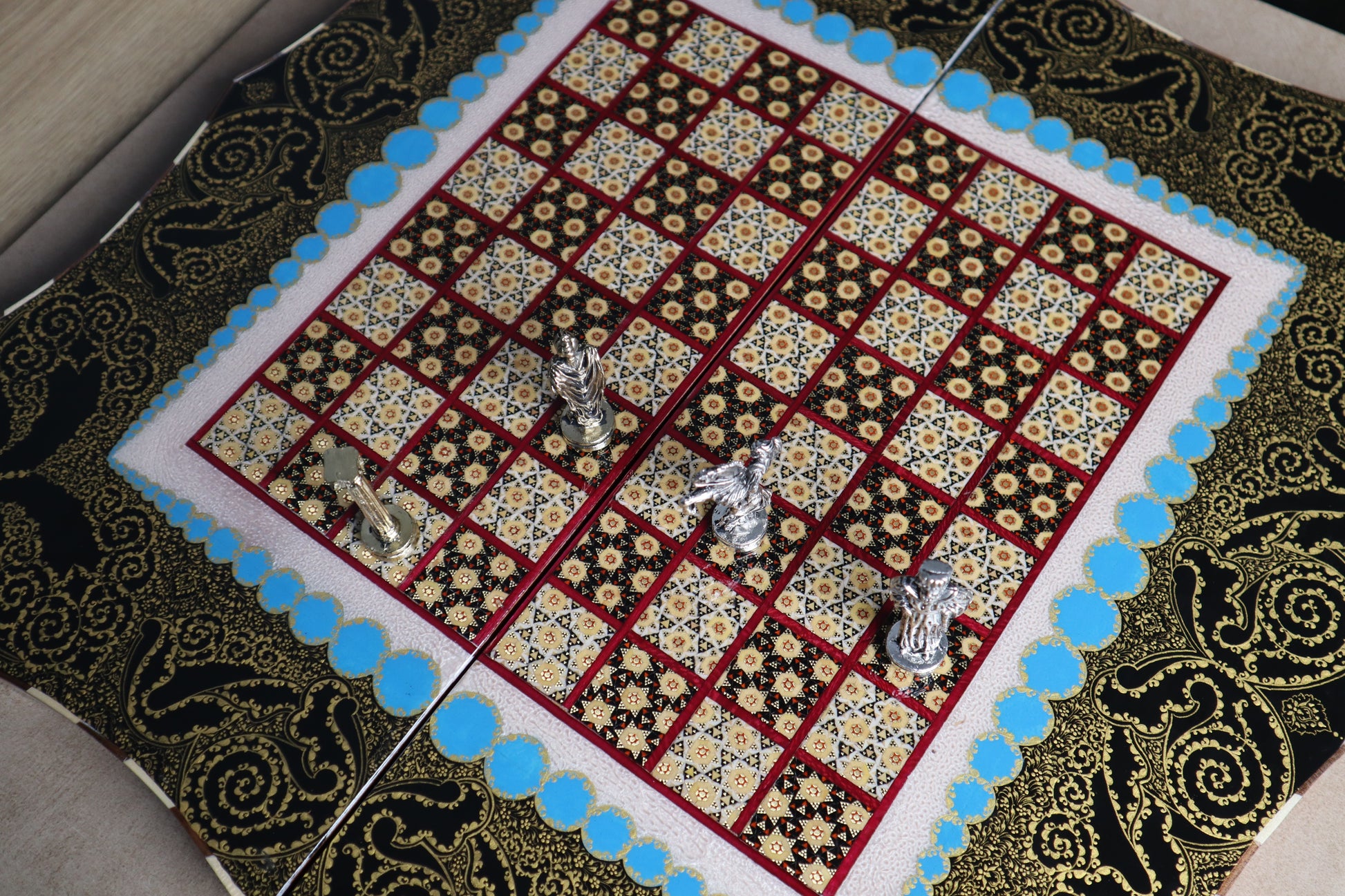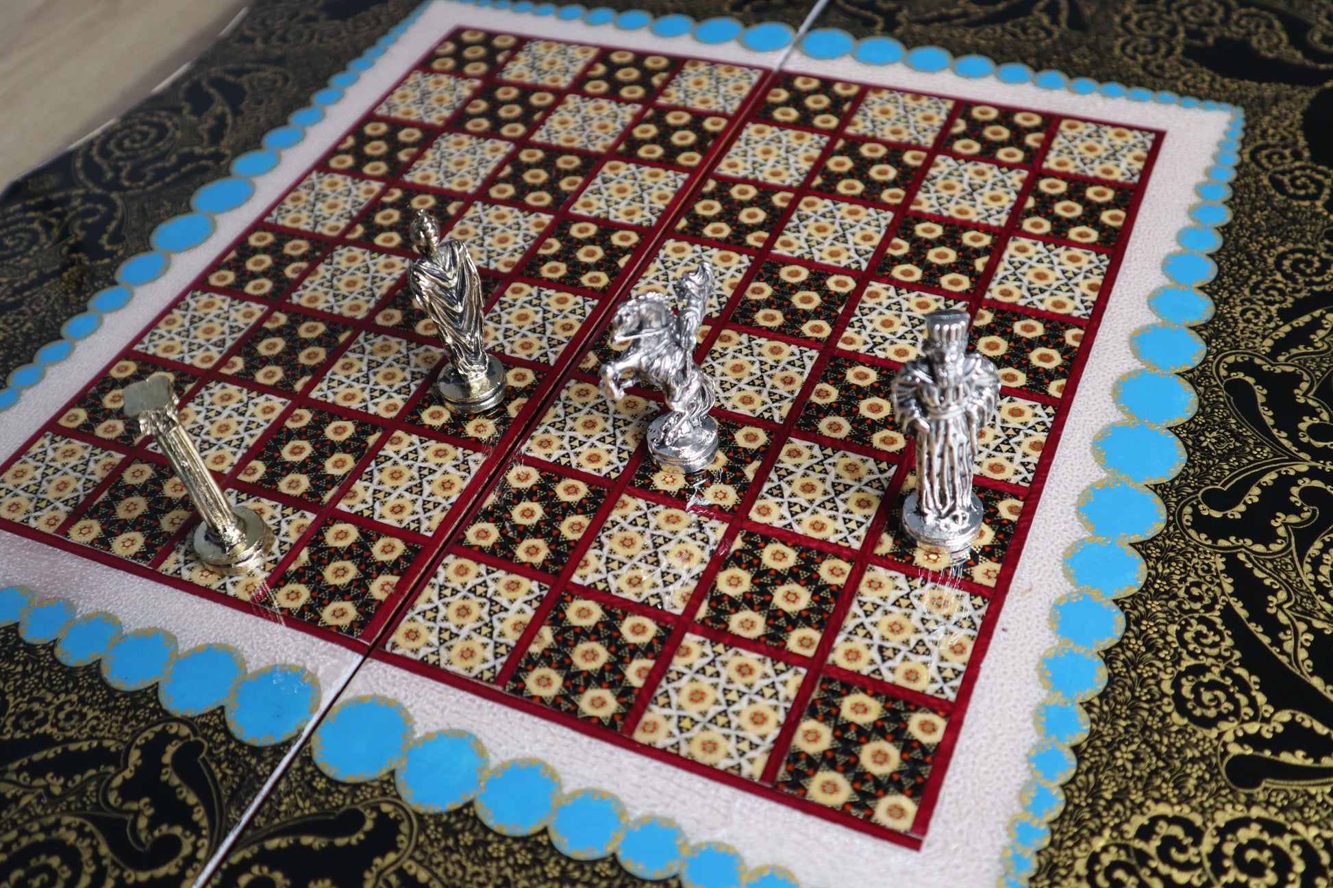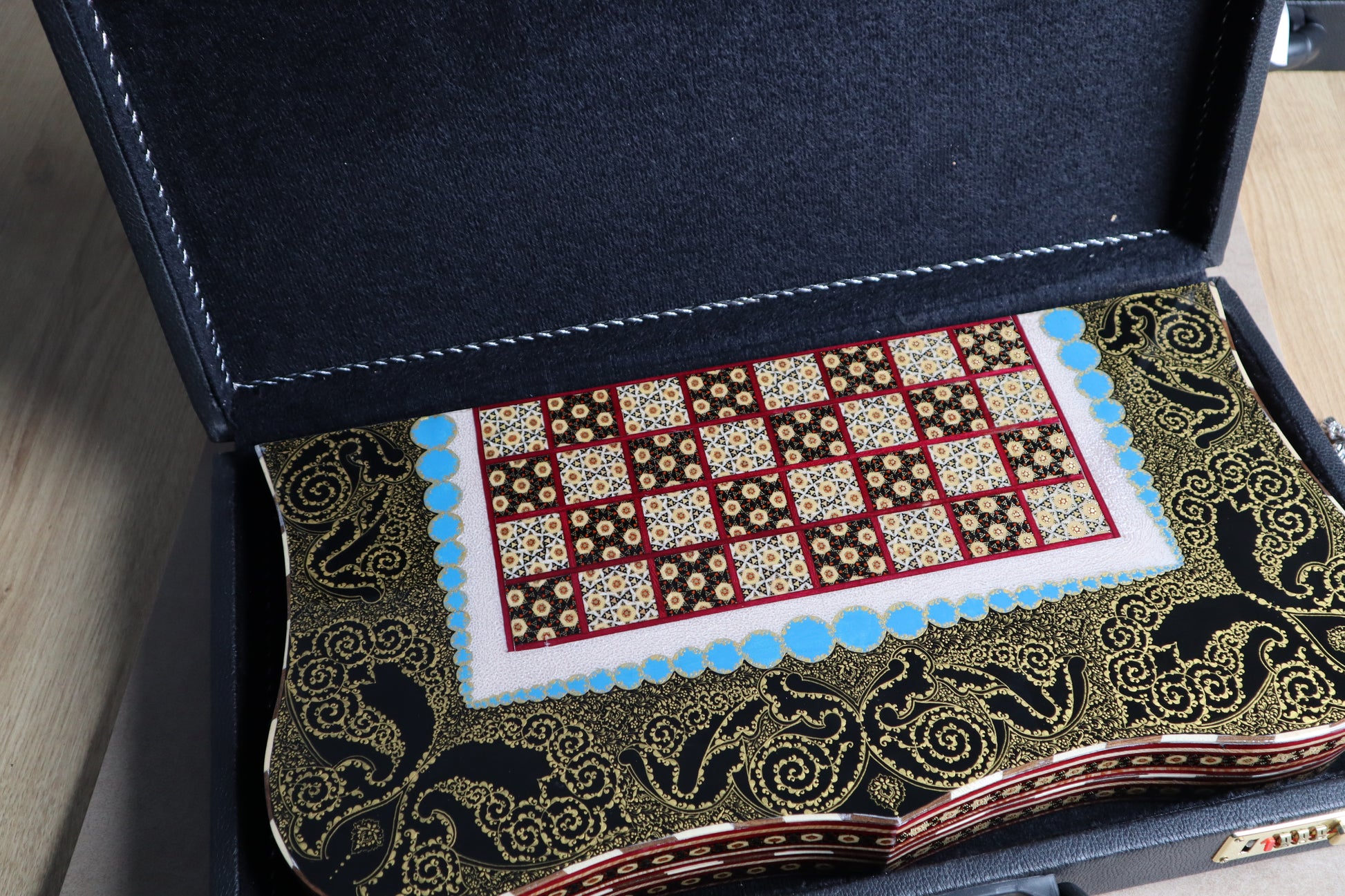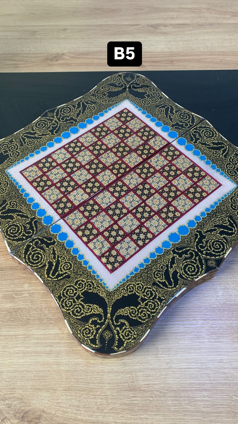 طاولي + شطرنج زخرفة راقية صناعة يدوية - جنطة جلد فاخرة جنود براص B5
