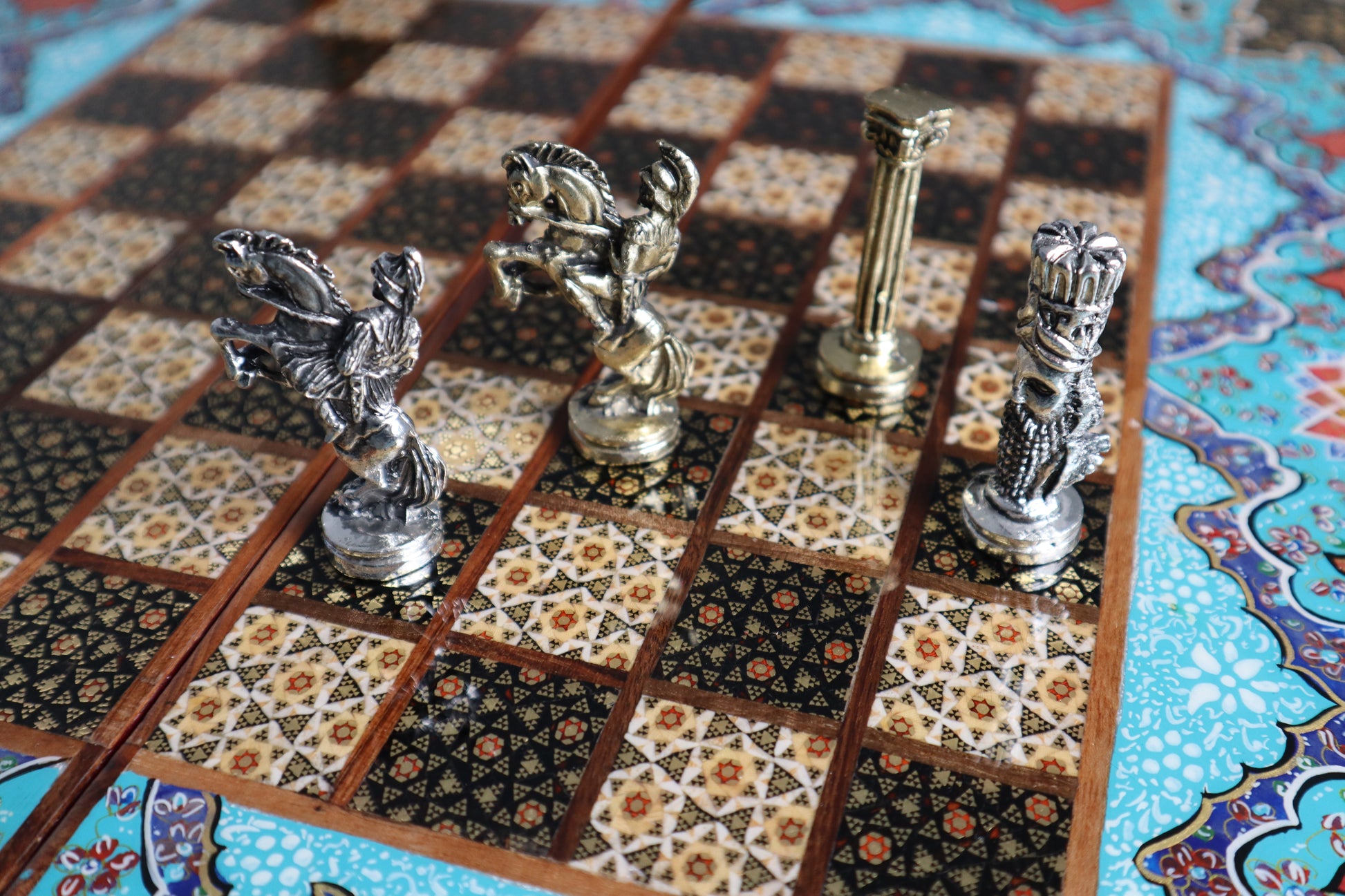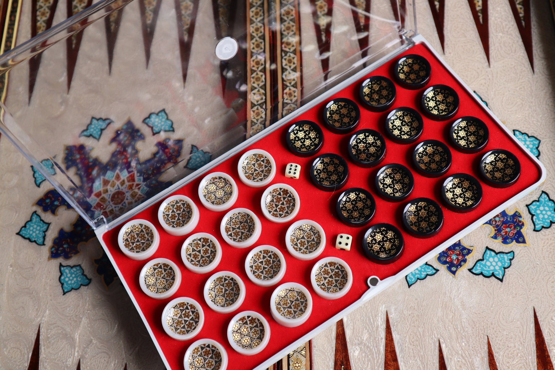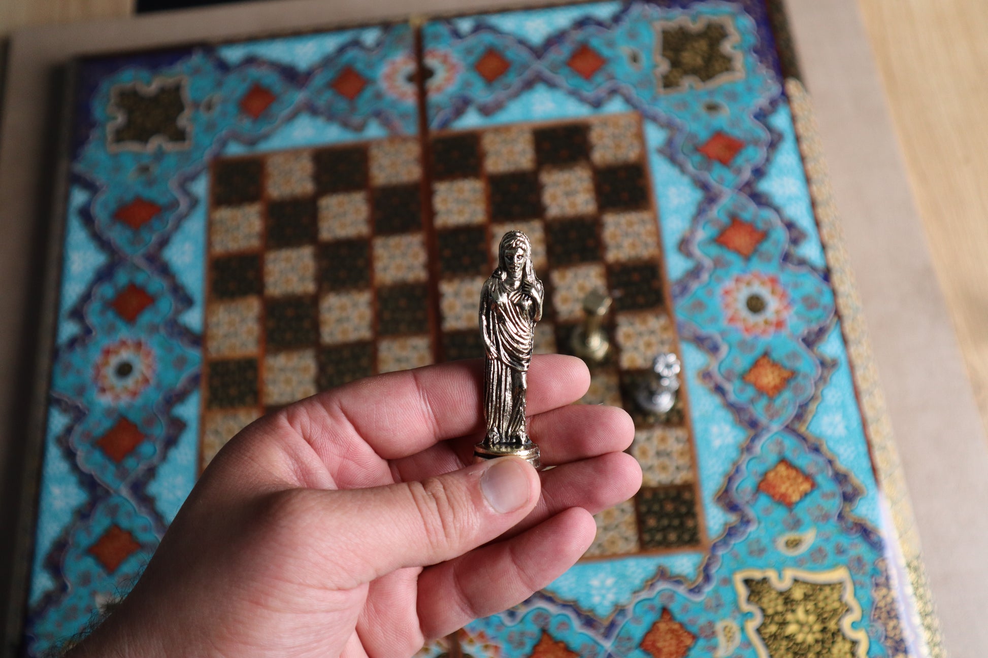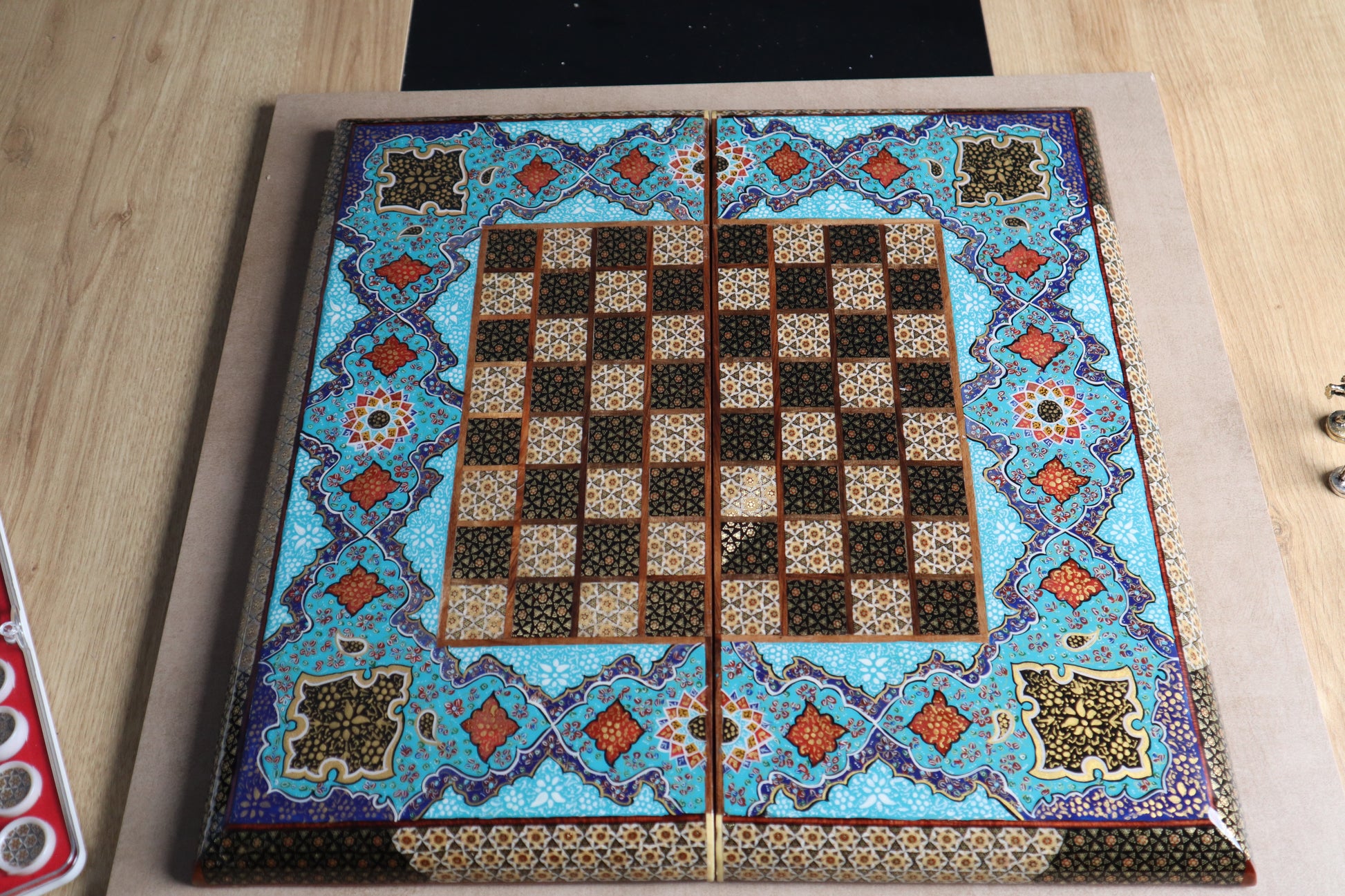 طاولي + شطرنج زخرفة راقية صناعة يدوية - جنطة جلد فاخرة جنود براص B7