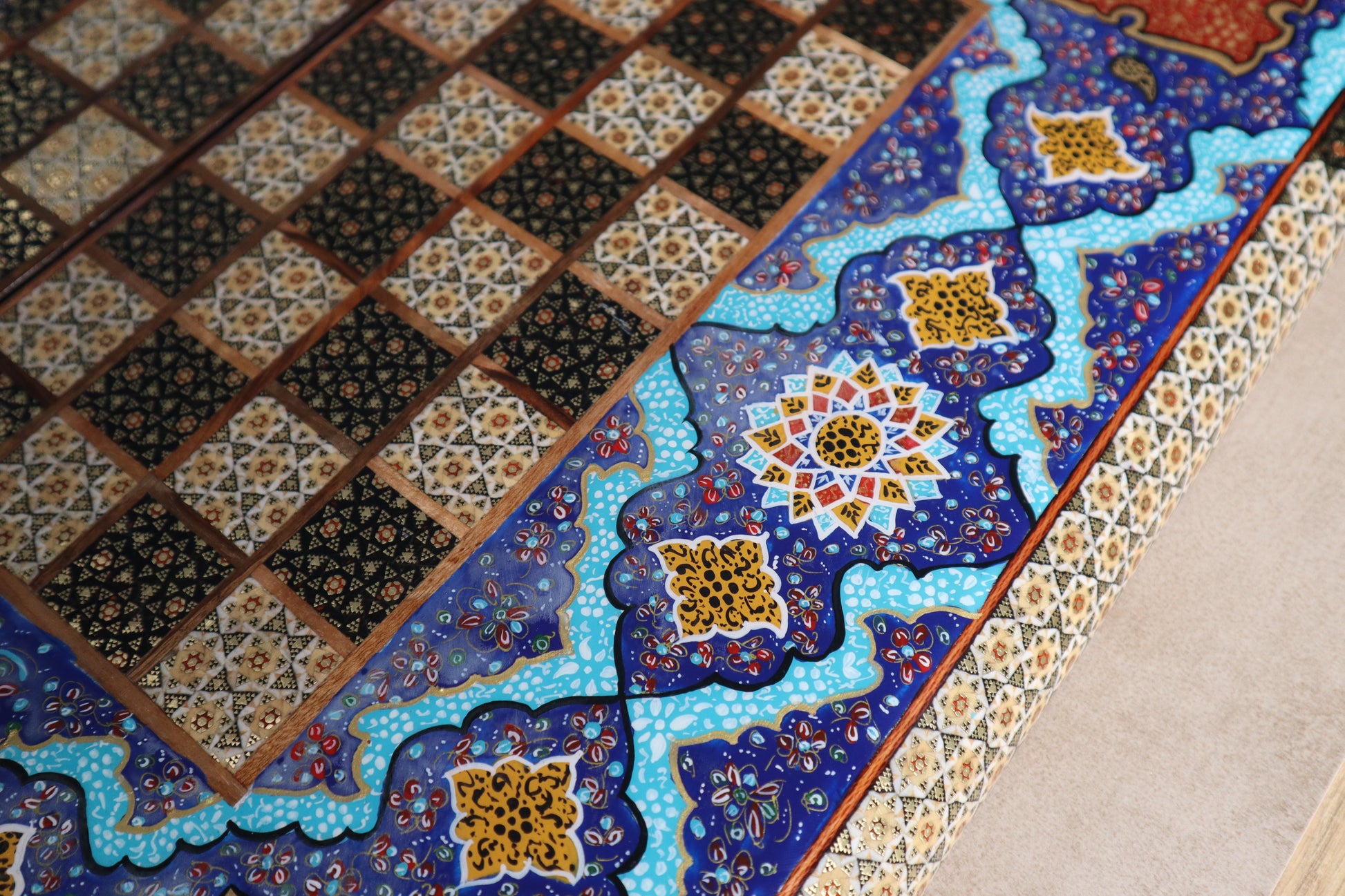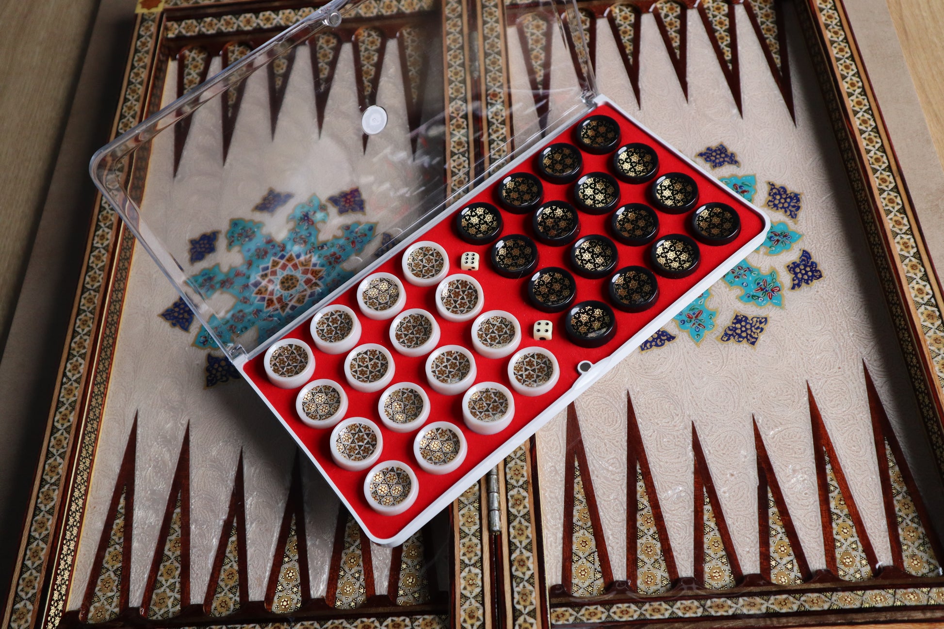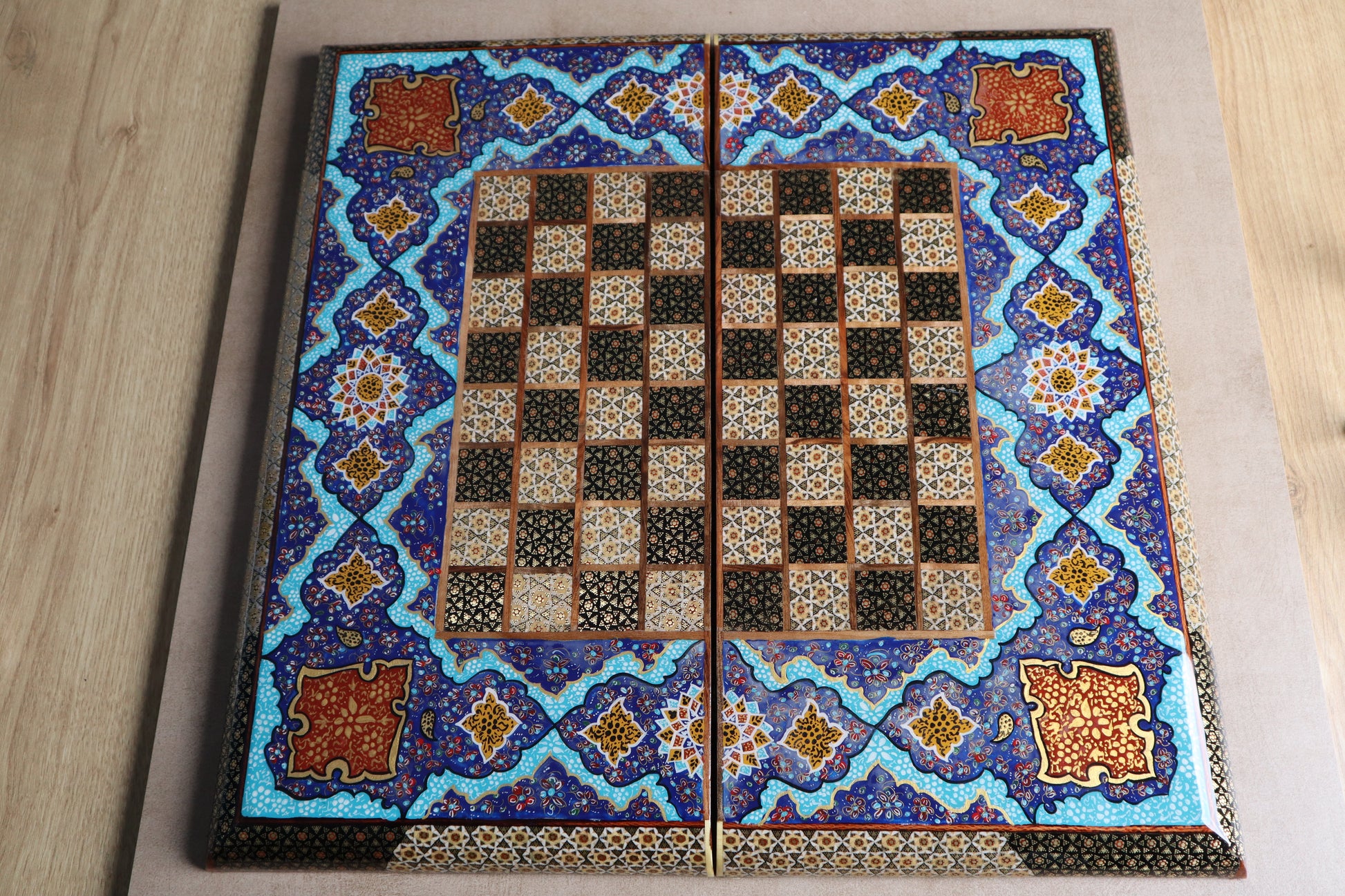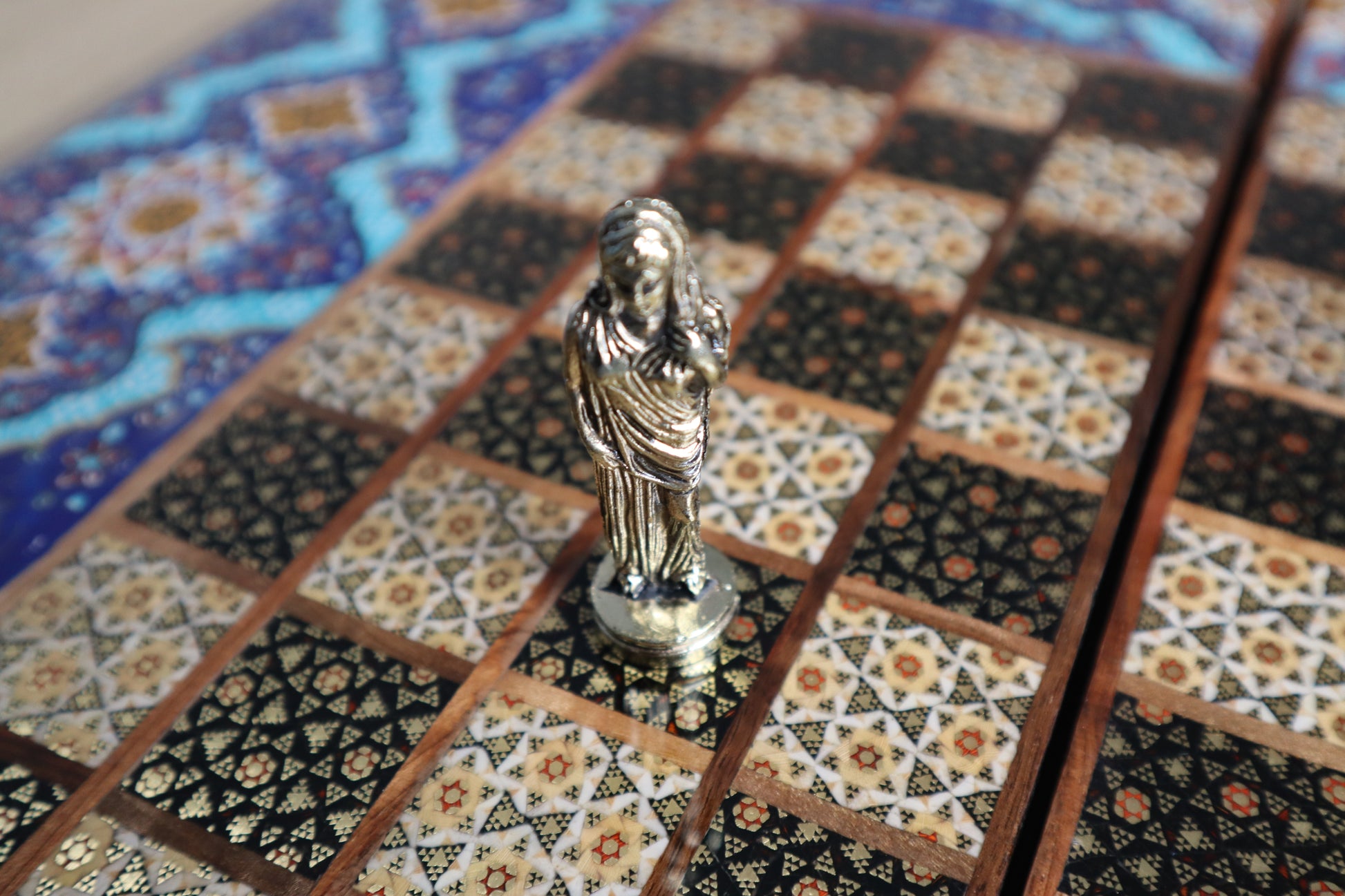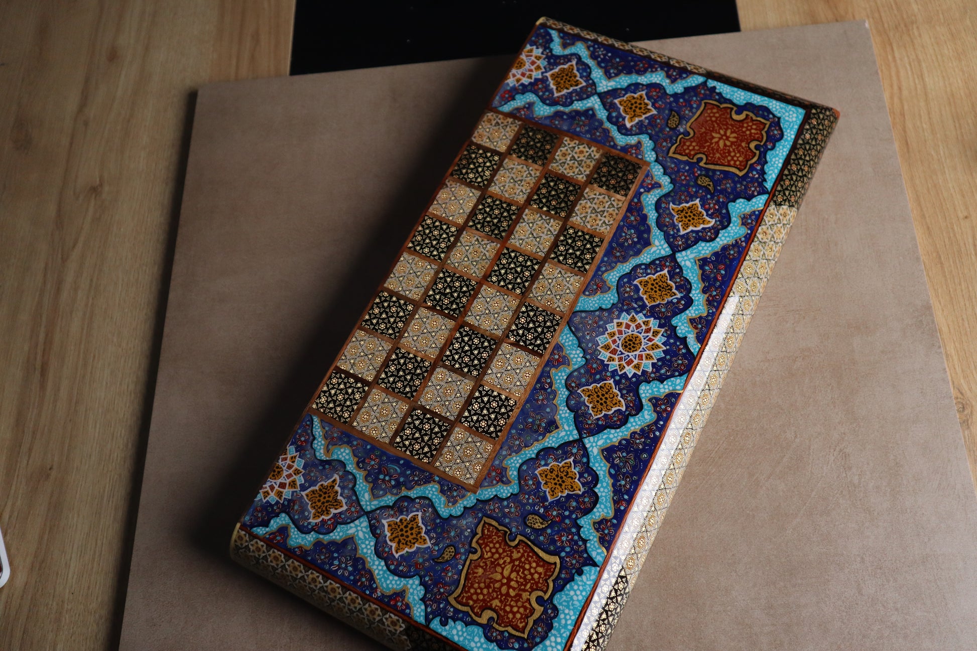 طاولي + شطرنج زخرفة راقية صناعة يدوية - جنطة جلد فاخرة جنود براص B6