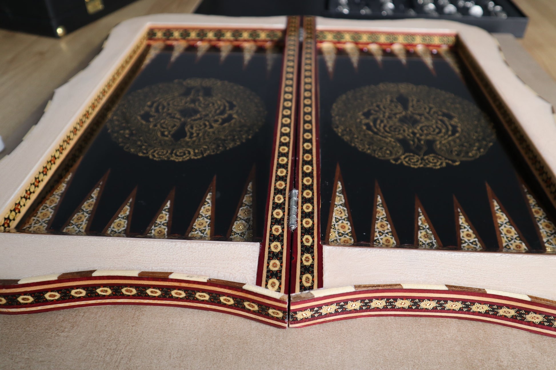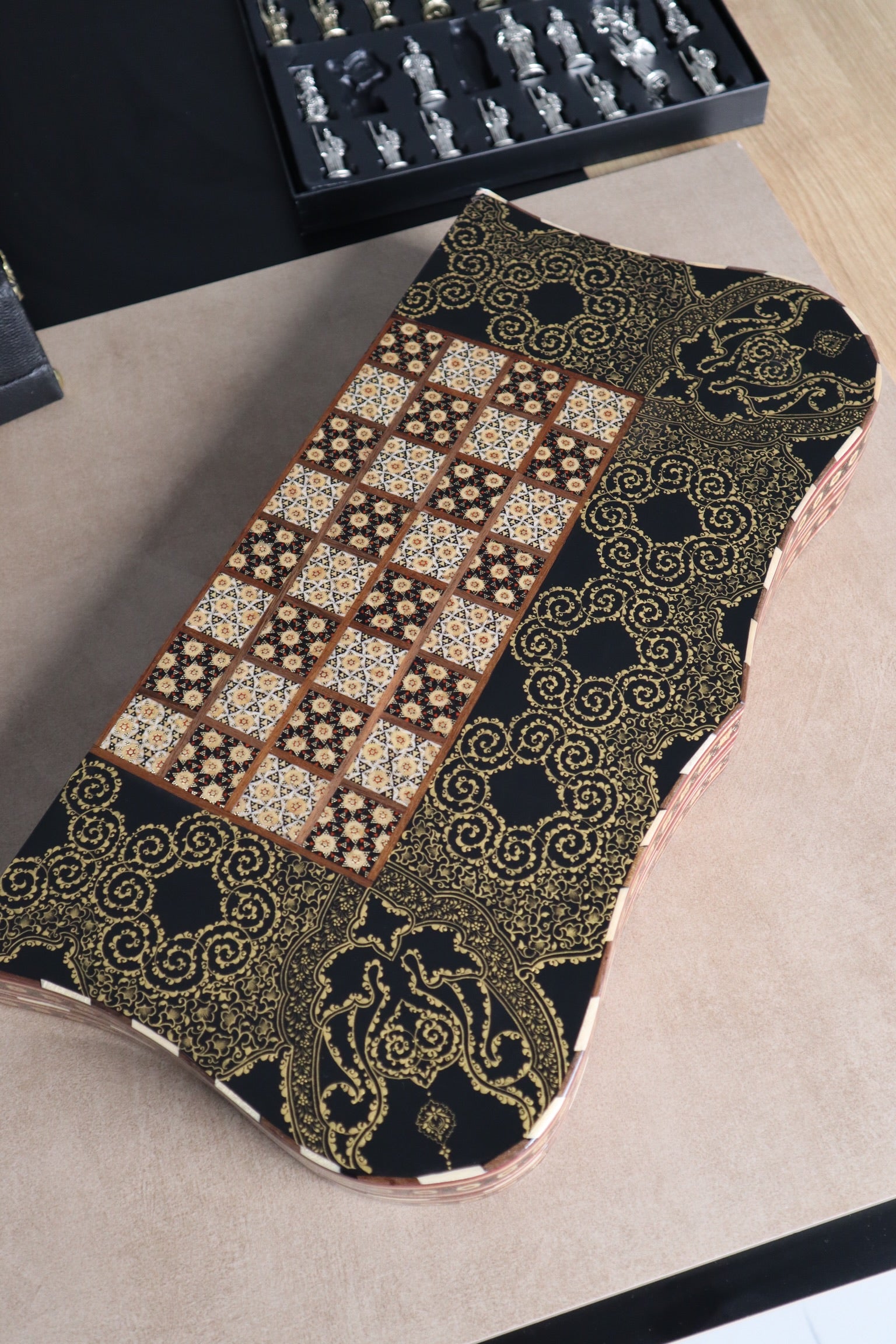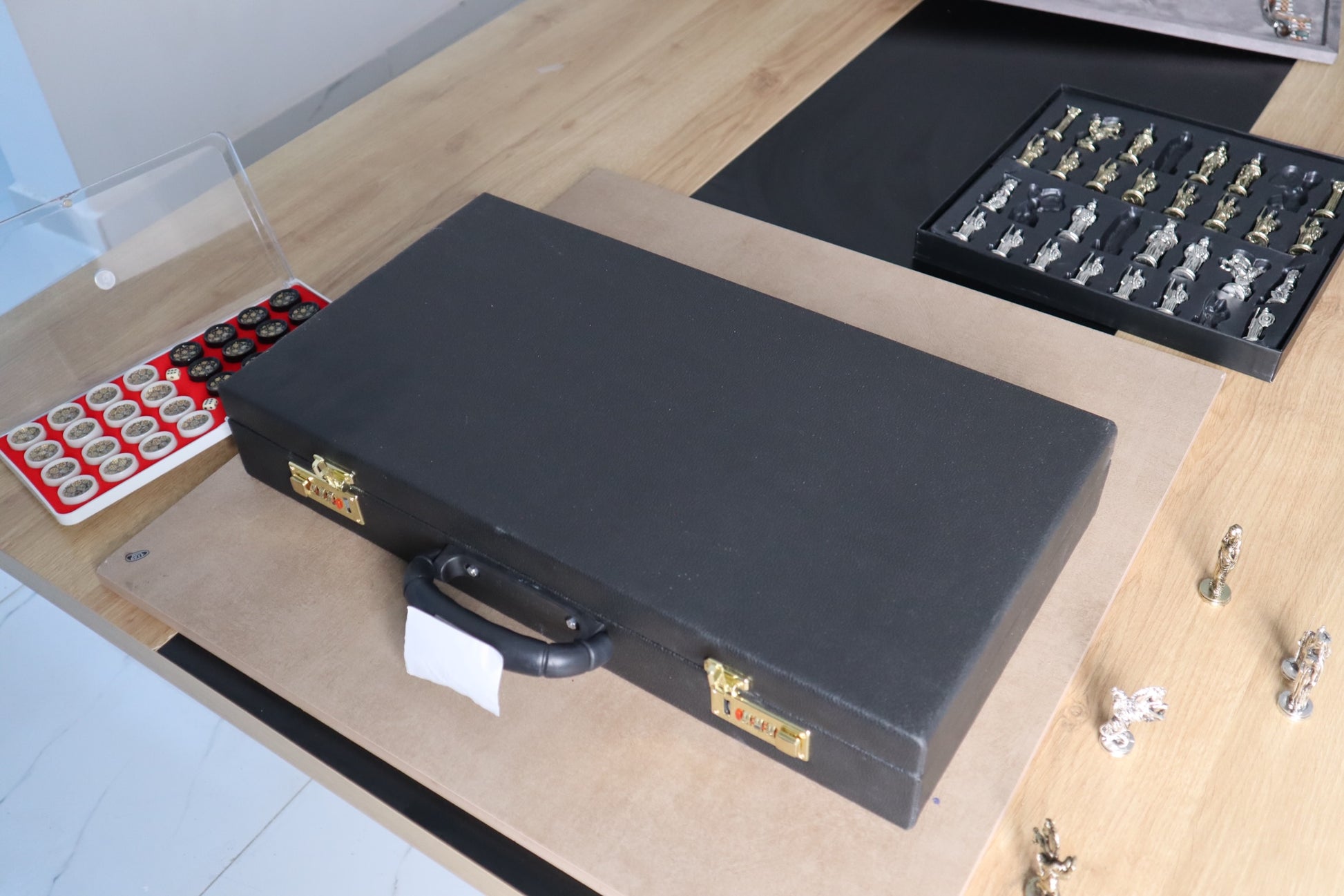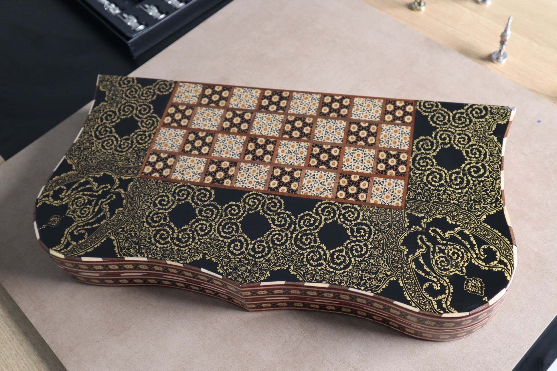 طاولي + شطرنج زخرفة سوداء راقية صناعة يدوية - جنطة جلد فاخرة السعر بدون احجار شطرنج ٥٥٠ الف ومع احجار شطرنج ٦٥٠ الف