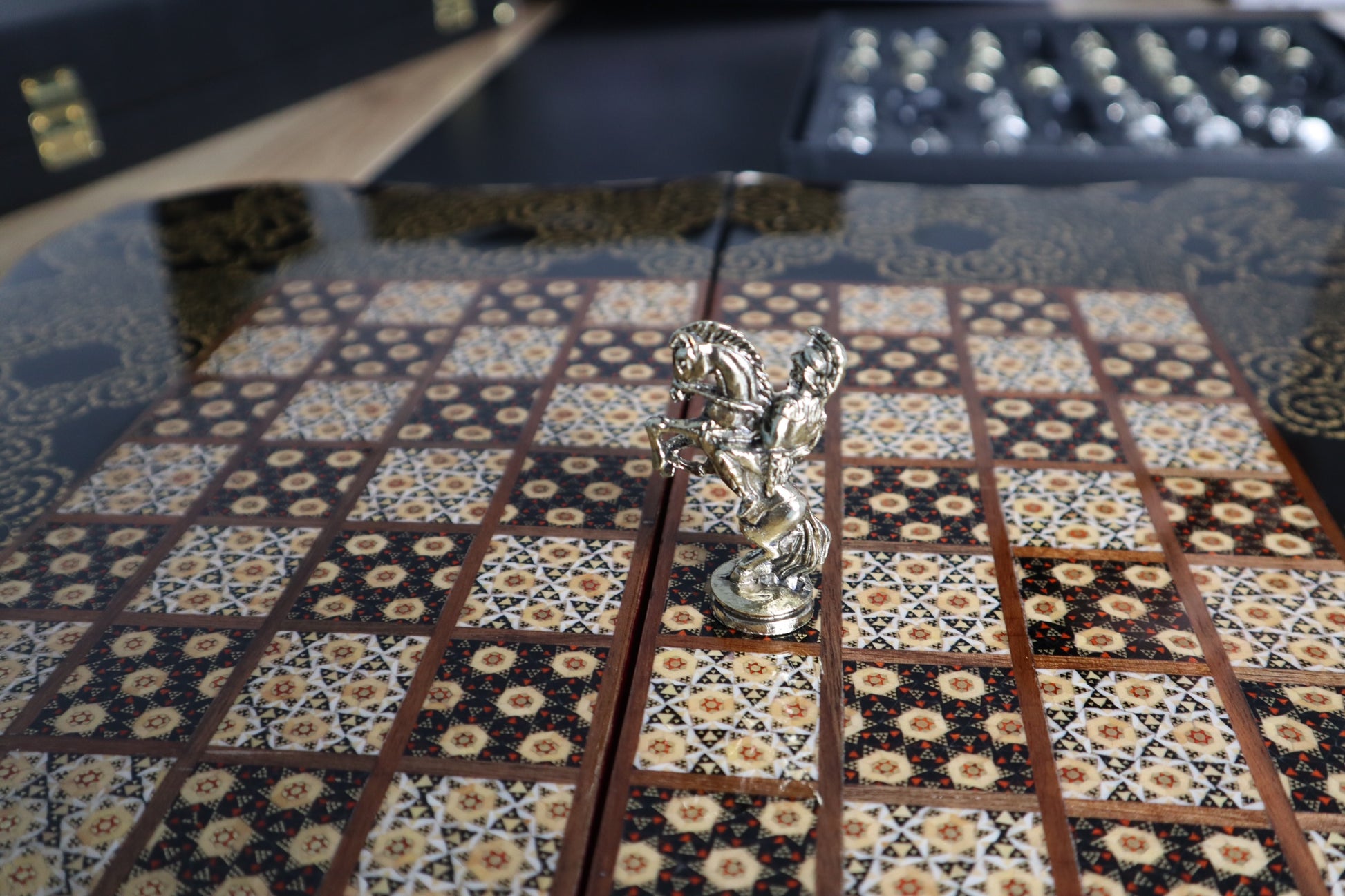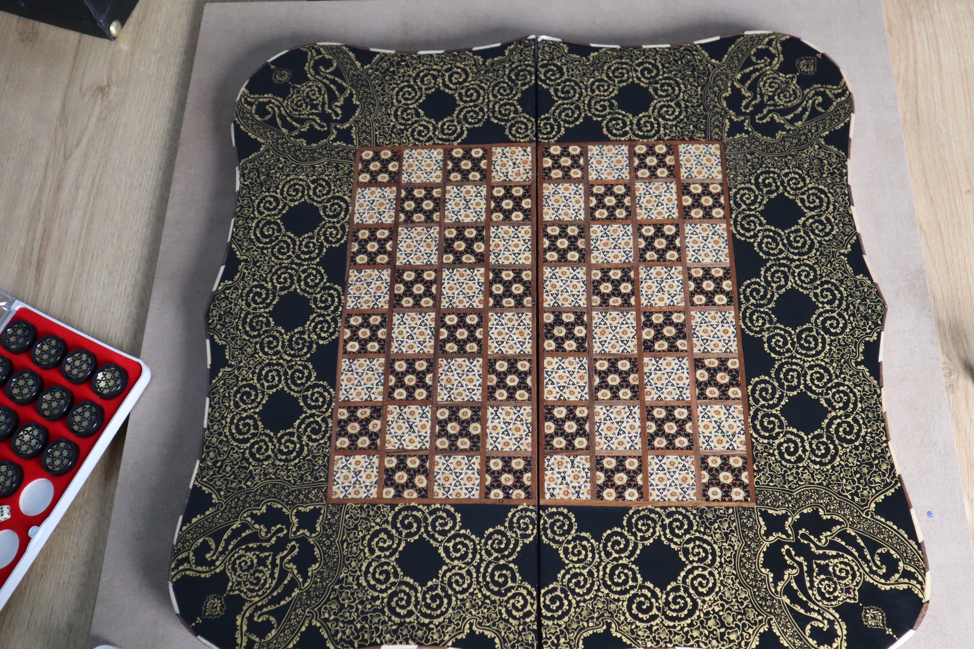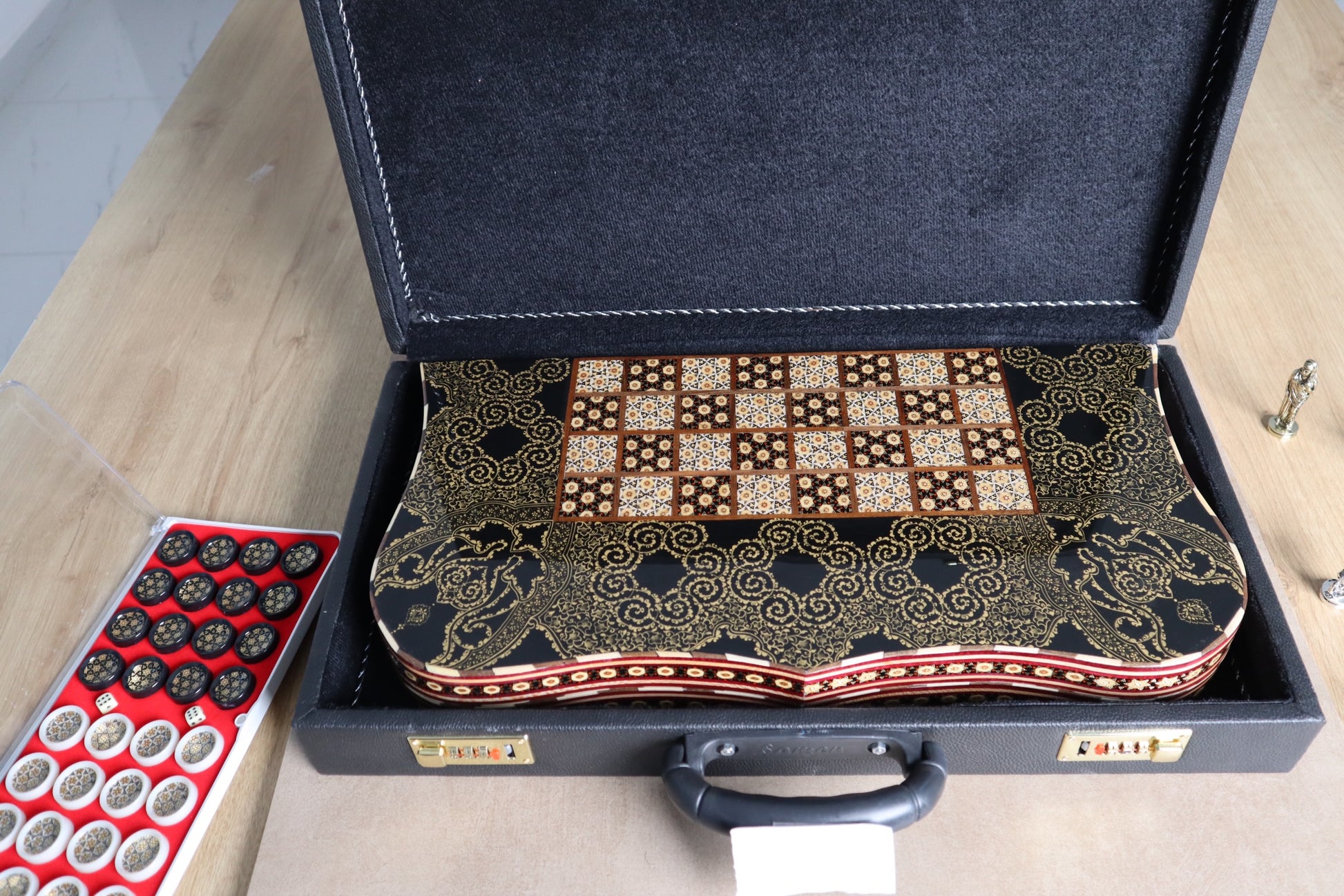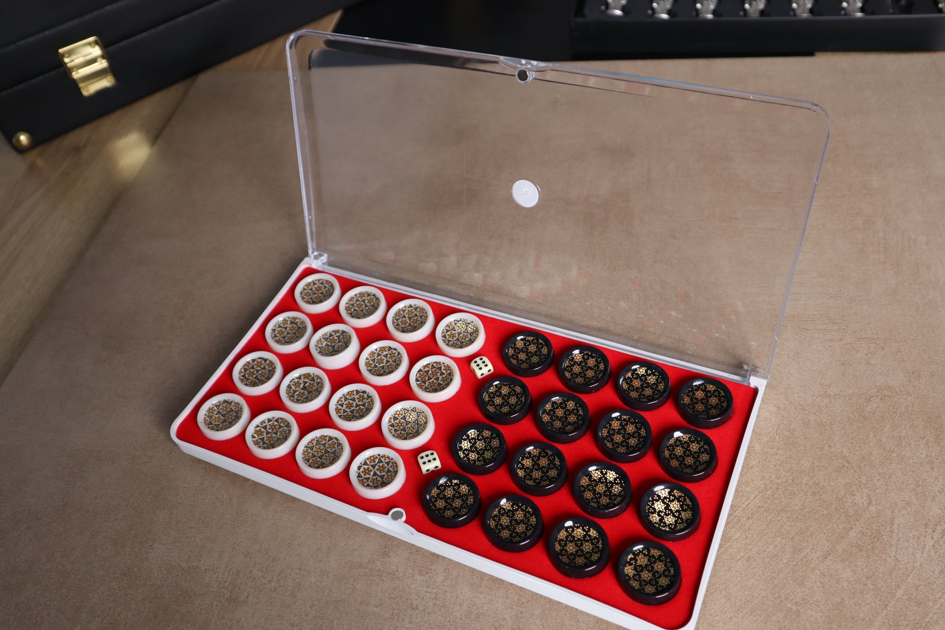 طاولي + شطرنج زخرفة سوداء راقية صناعة يدوية - جنطة جلد فاخرة السعر بدون احجار شطرنج ٥٥٠ الف ومع احجار شطرنج ٦٥٠ الف