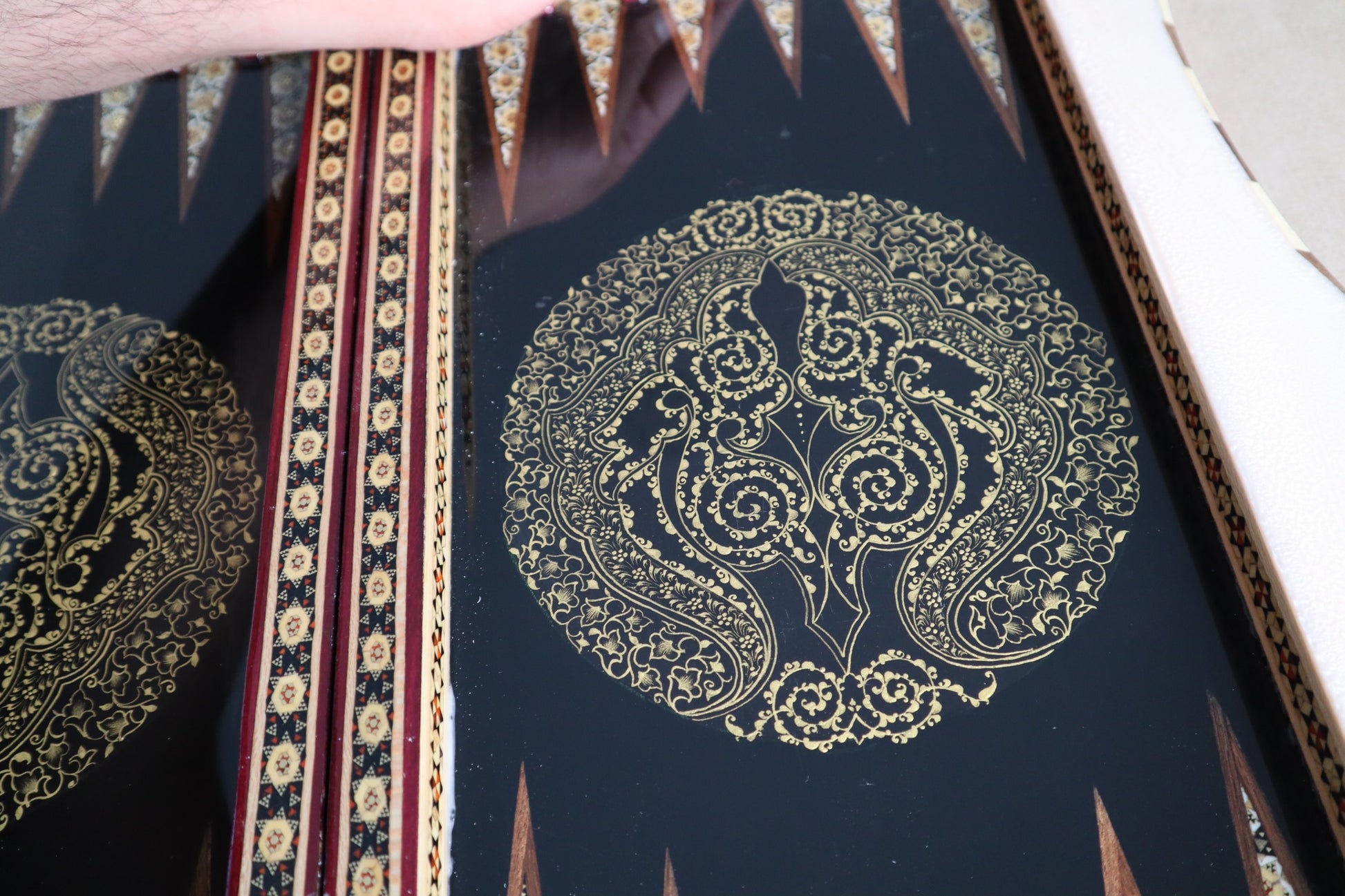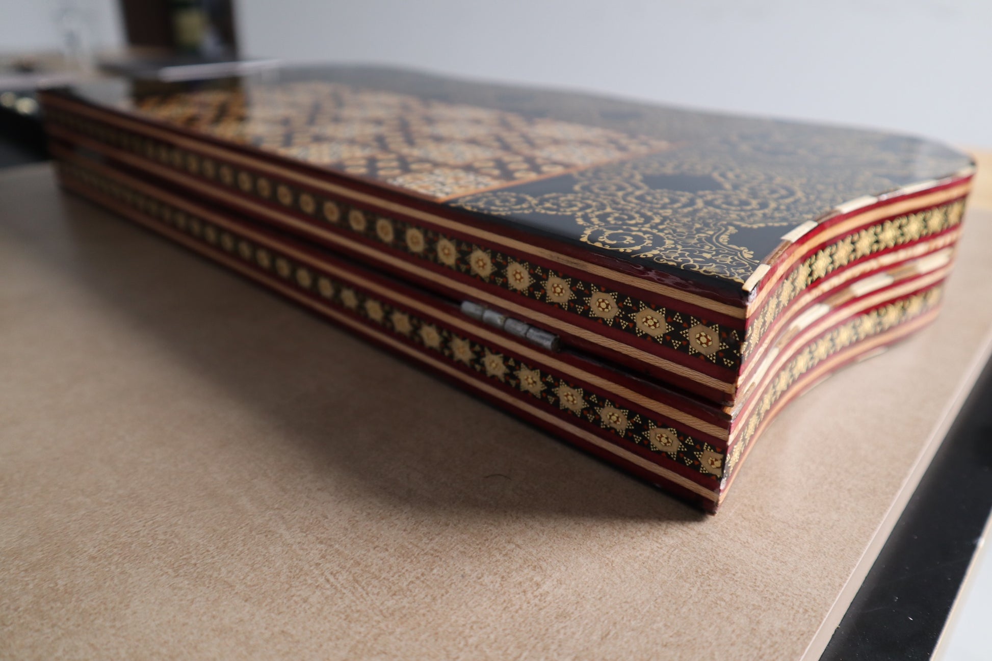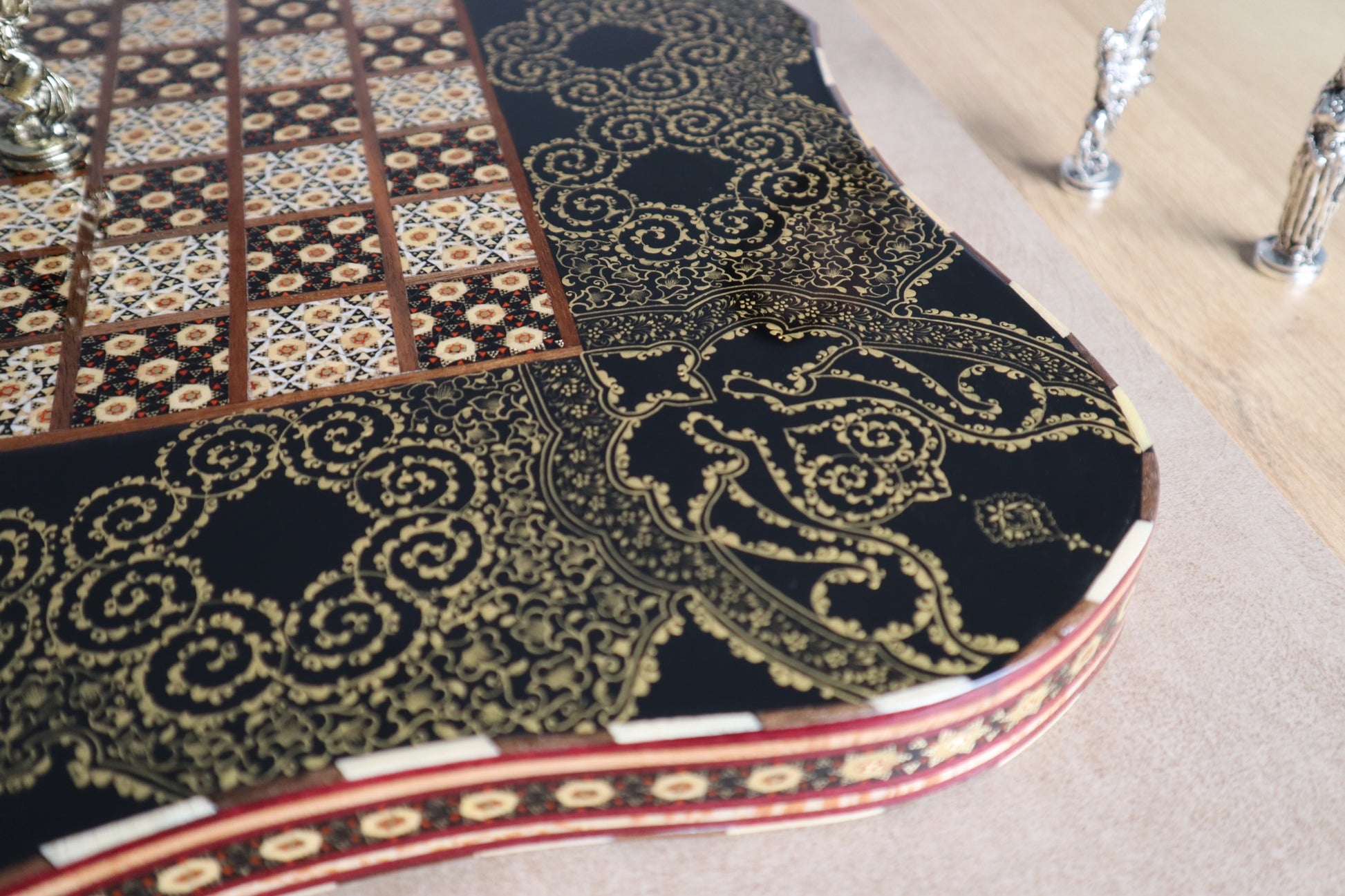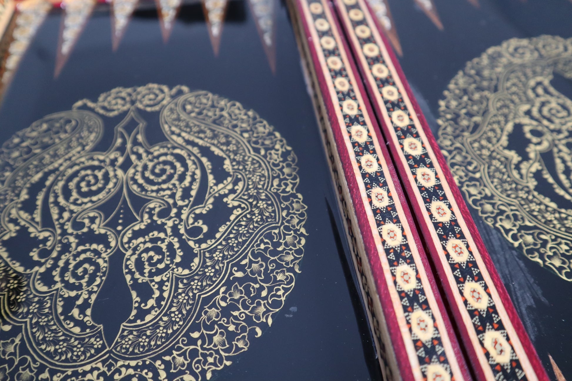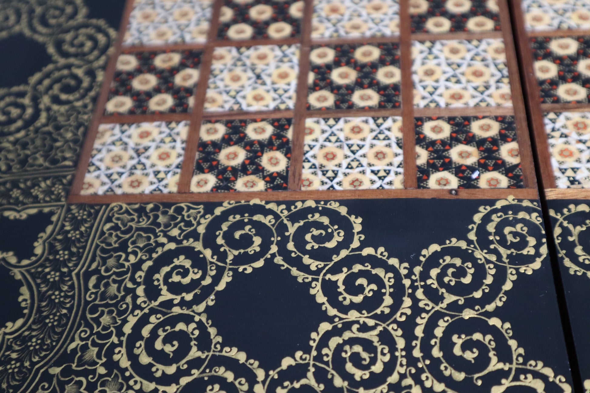 طاولي + شطرنج زخرفة سوداء راقية صناعة يدوية - جنطة جلد فاخرة السعر بدون احجار شطرنج ٥٥٠ الف ومع احجار شطرنج ٦٥٠ الف