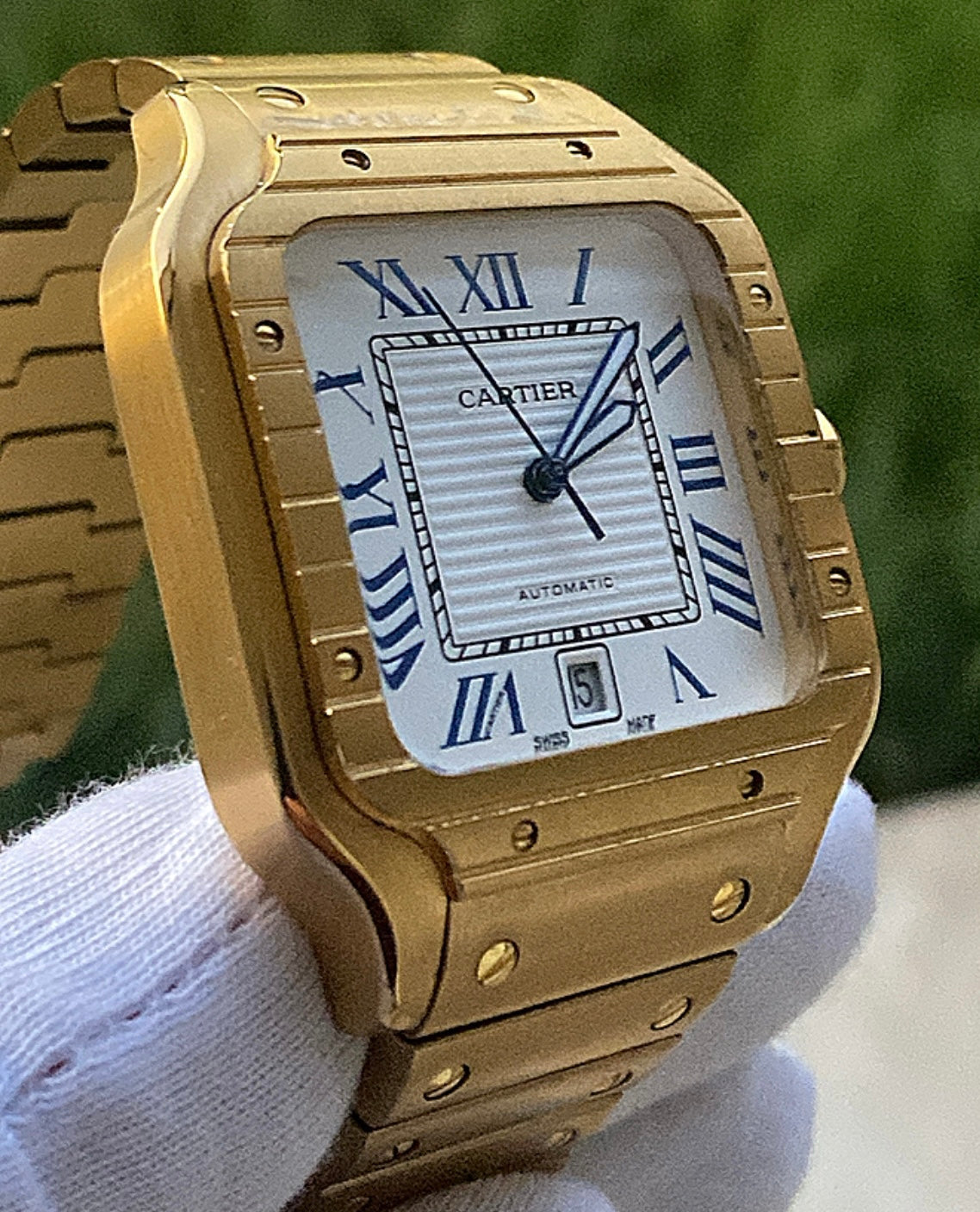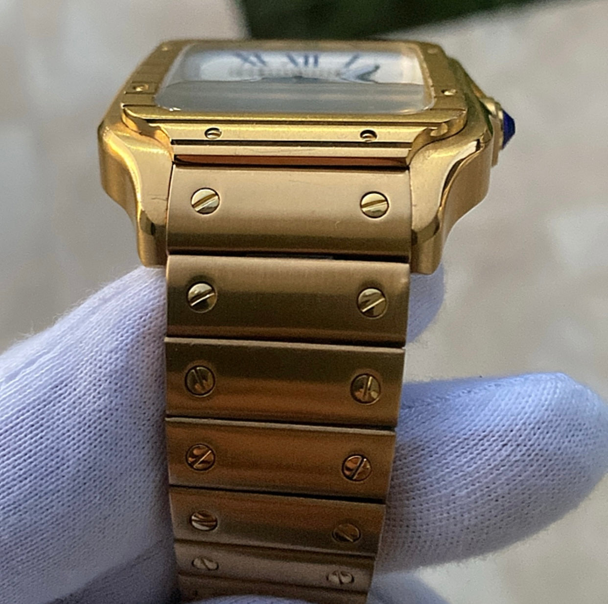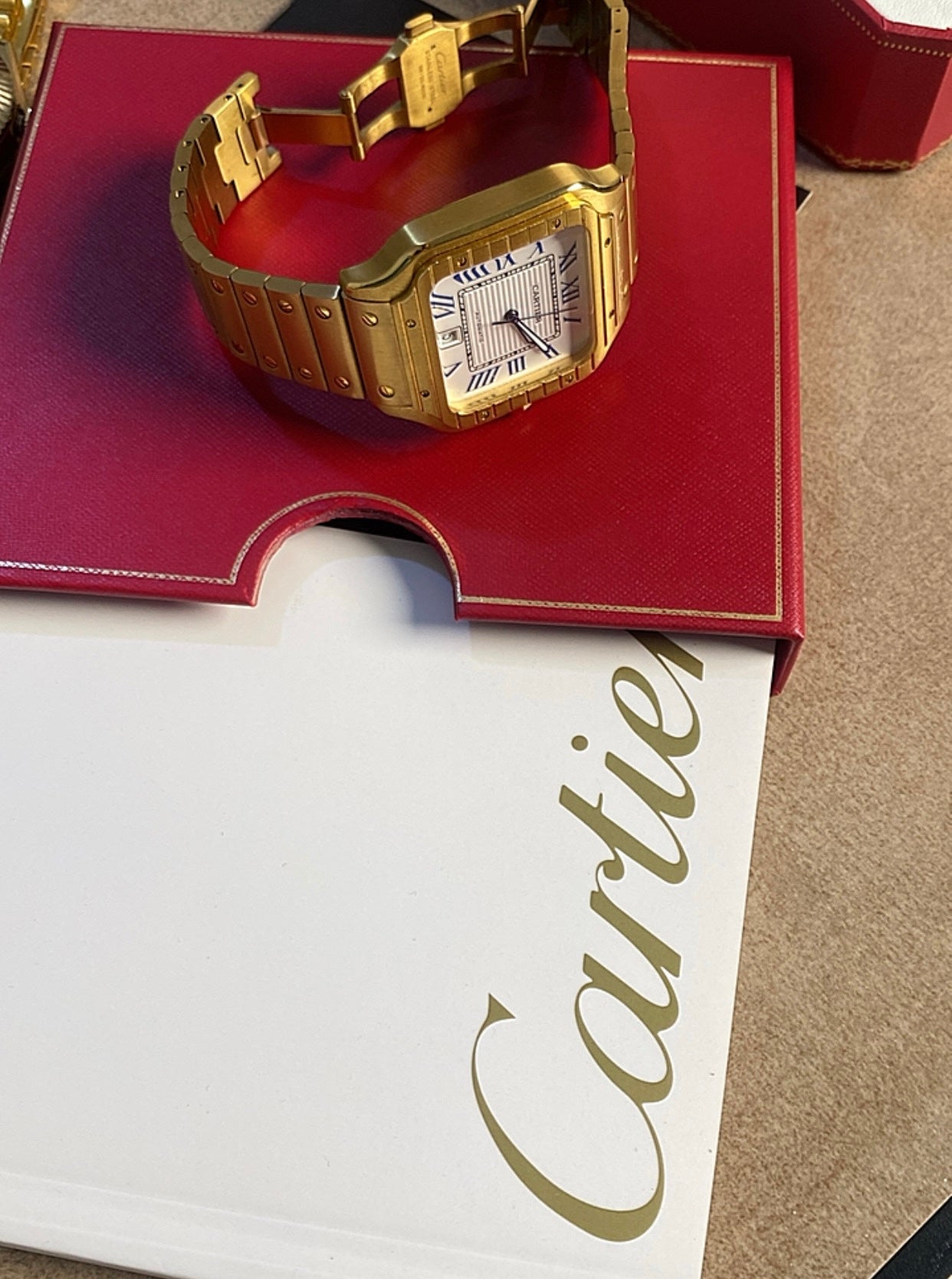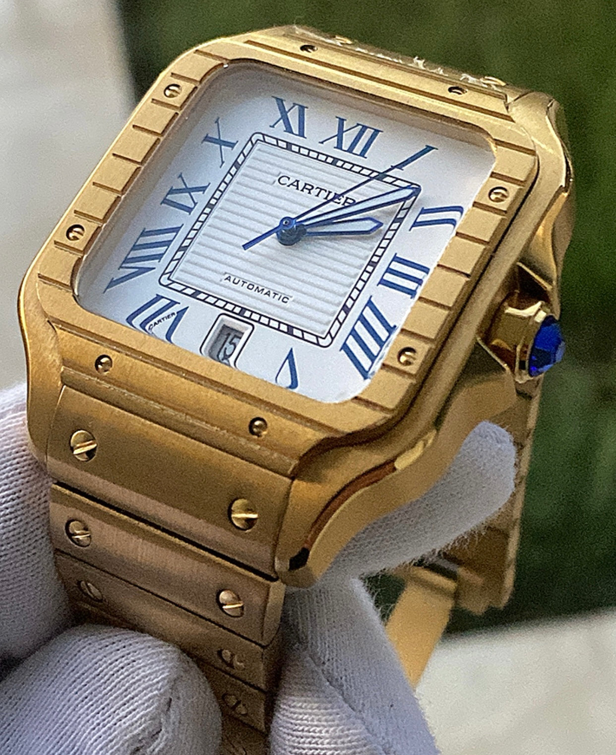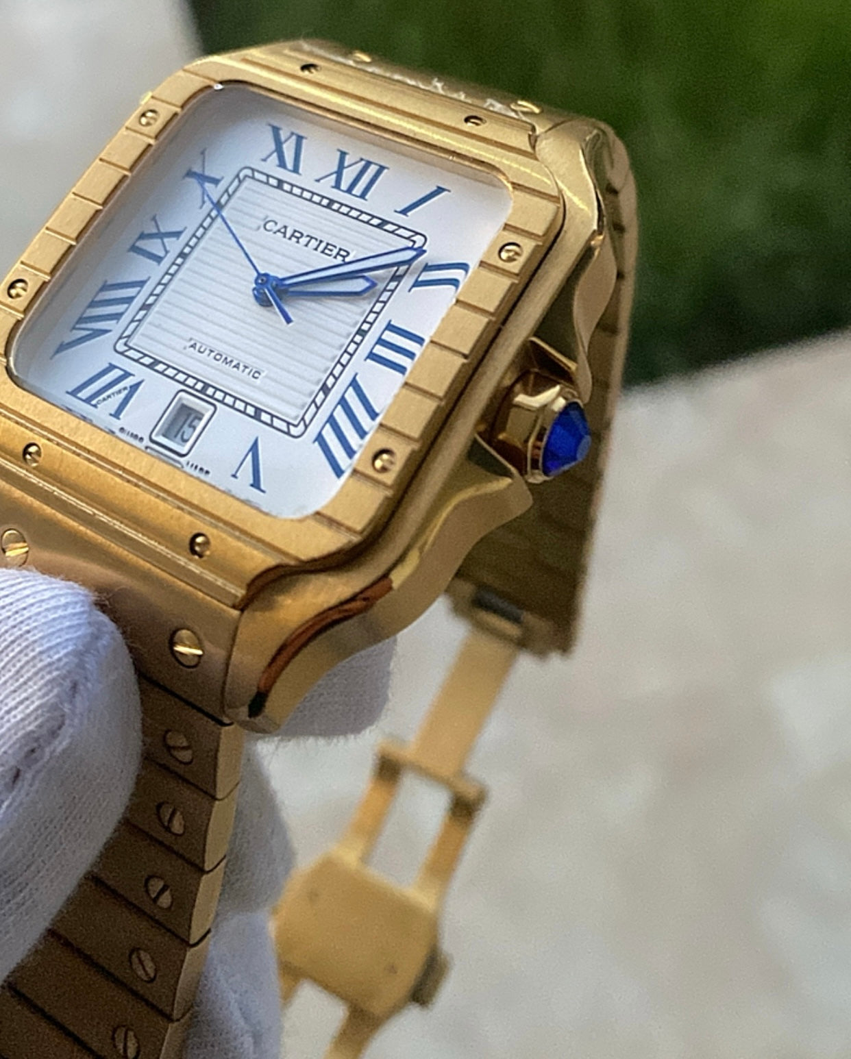 كارتير سانتوس ذهبي مينا ابيض اوتوماتيك ماكينة سويسري مستعمل بحالة الجديد اصدار ٢٠٢٣